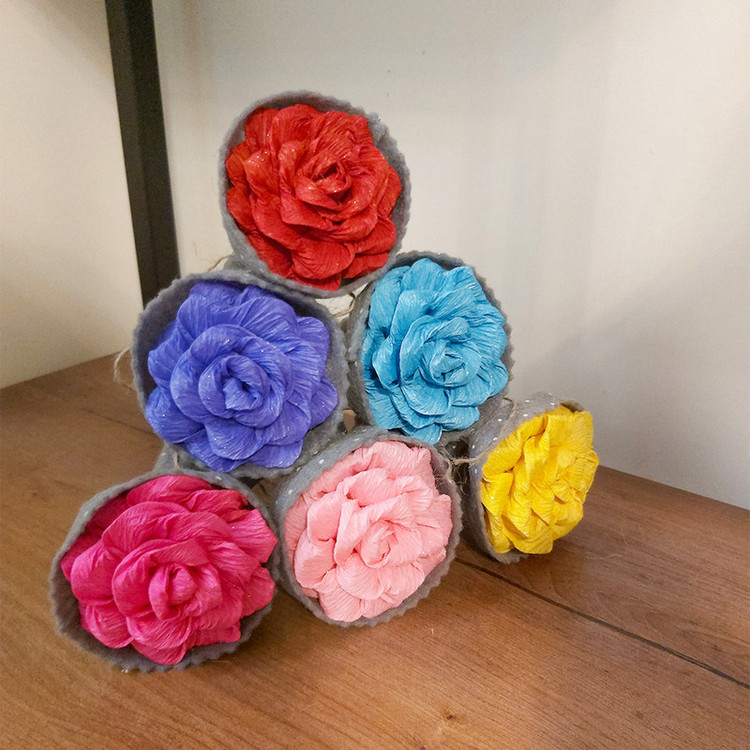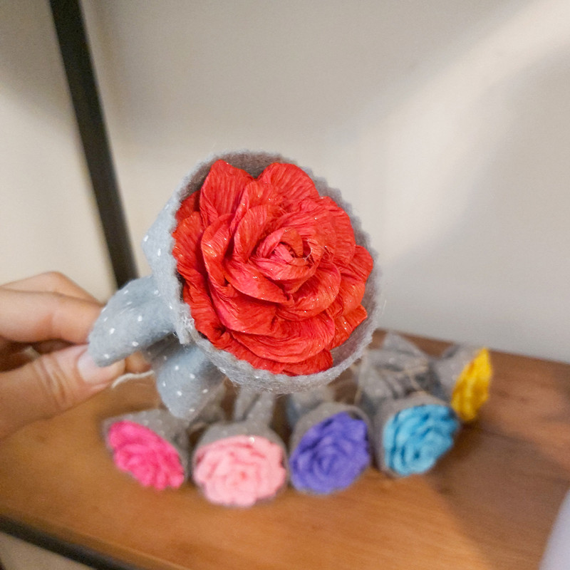 سایر توضیحات: گلهای رز کاغذی از جنس کاغذکشی بوده و دور پیچ گلها نیز نمدی و با رنگ طوسی می باشد.