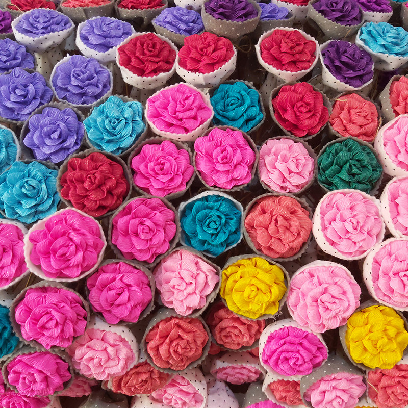 گلهای رز کاغذی از جنس کاغذکشی بوده و دور پیچ گلها نیز نمدی و با رنگ طوسی می باشد.