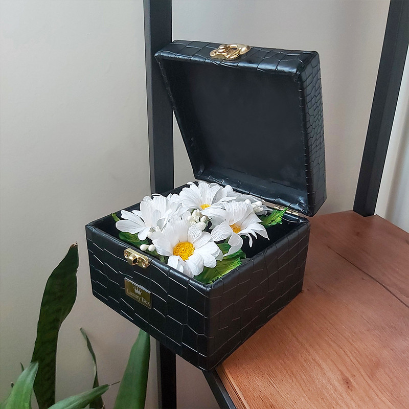 دستهبندی: باکس گلابعاد: 14x14x10 سانتیمترجنس: چوبسایر توضیحات: باکس از جنس چوب و روکش آن از چرم می باشد، گل های بابونه زیبا از جنس کاغذکشی و بسیار مشابه گل طبیعی می باشند.