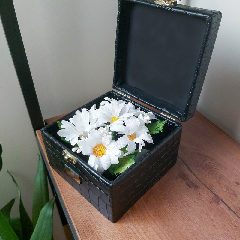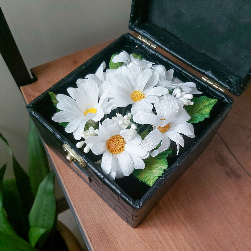ابعاد14x14x10 سانتیمترجنسچوبسایر توضیحاتباکس از جنس چوب و روکش آن از چرم می باشد، گل های بابونه زیبا از جنس کاغذکشی و بسیار مشابه گل طبیعی می باشند.